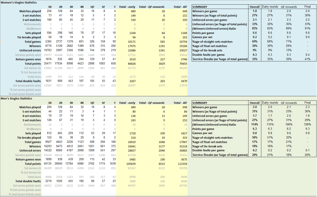 Since the 2013 US Open (this post was originally written in 2014), I’ve been collecting the statistics published by the grand slam tennis tournaments in a spreadsheet. This was prompted by a discussion on sexism in tennis about a year ago, where I saw someone say he didn’t watch women’s tennis these days as it was “full of unforced errors”. So I decided to have a look at what the stats were. And since they publish stats not only on unforced errors but many other measures as well, and they use an identical tabular format (links: Aus, French, Wim, US), it was easy to compare and aggregate them.