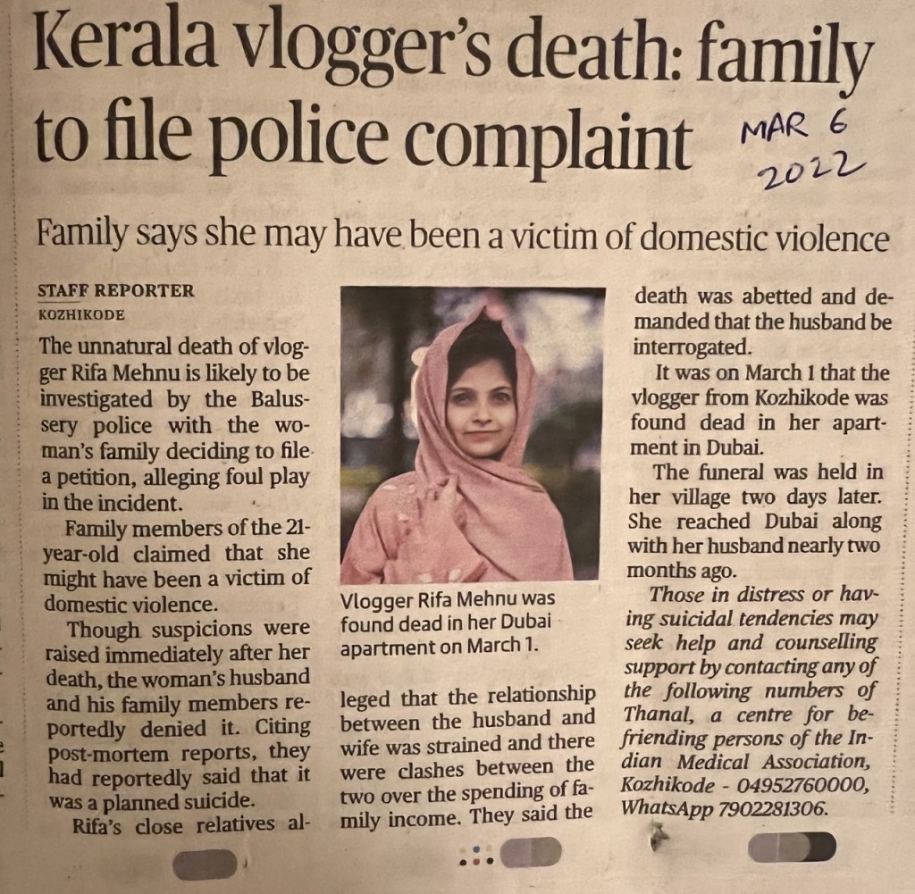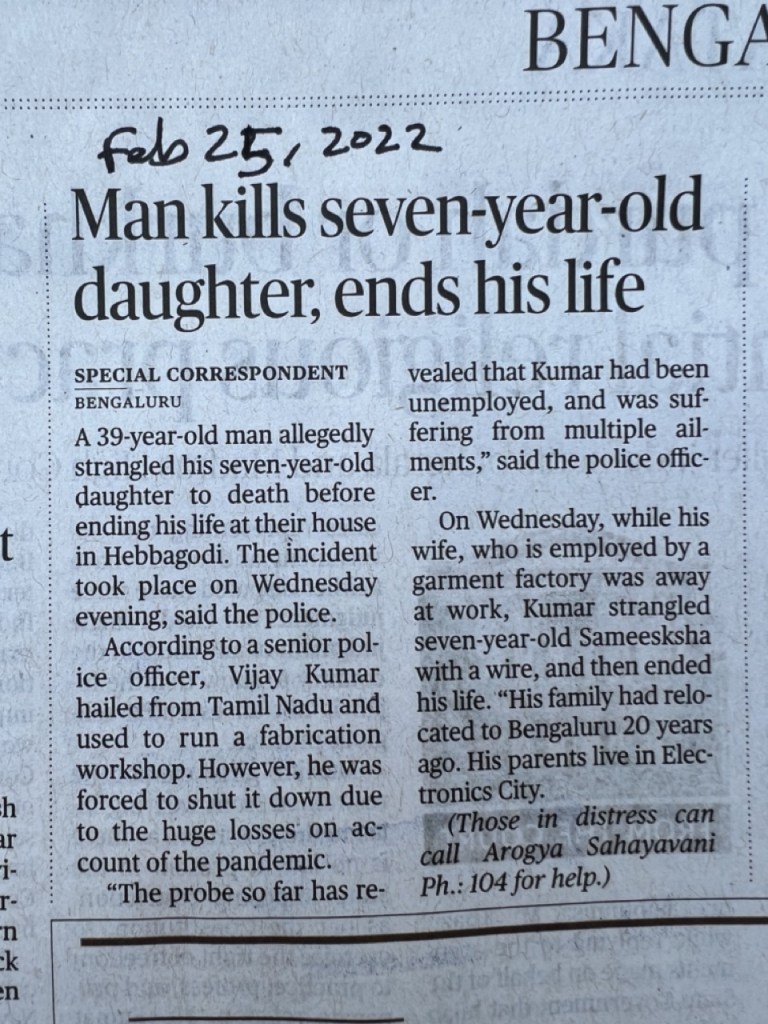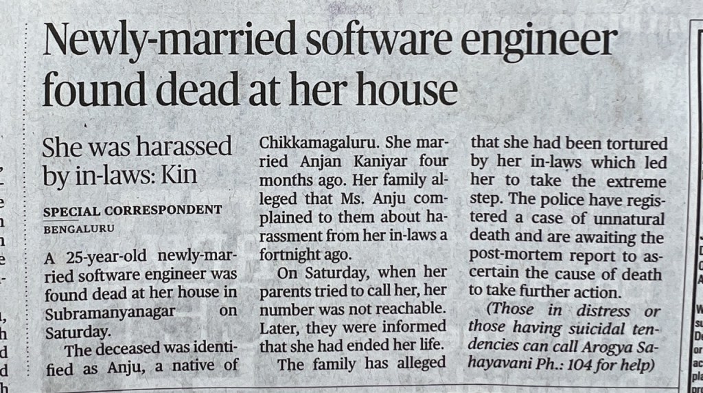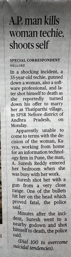 - In cases where the man subsequently commits suicide, the paper always puts the number of the Arogyavani 104 Health Helpline at the end. Those in distress or having suicidal tendencies. There is never any domestic violence helpline given. It’s as if they care more about the mental health of the murdering men than their victims.