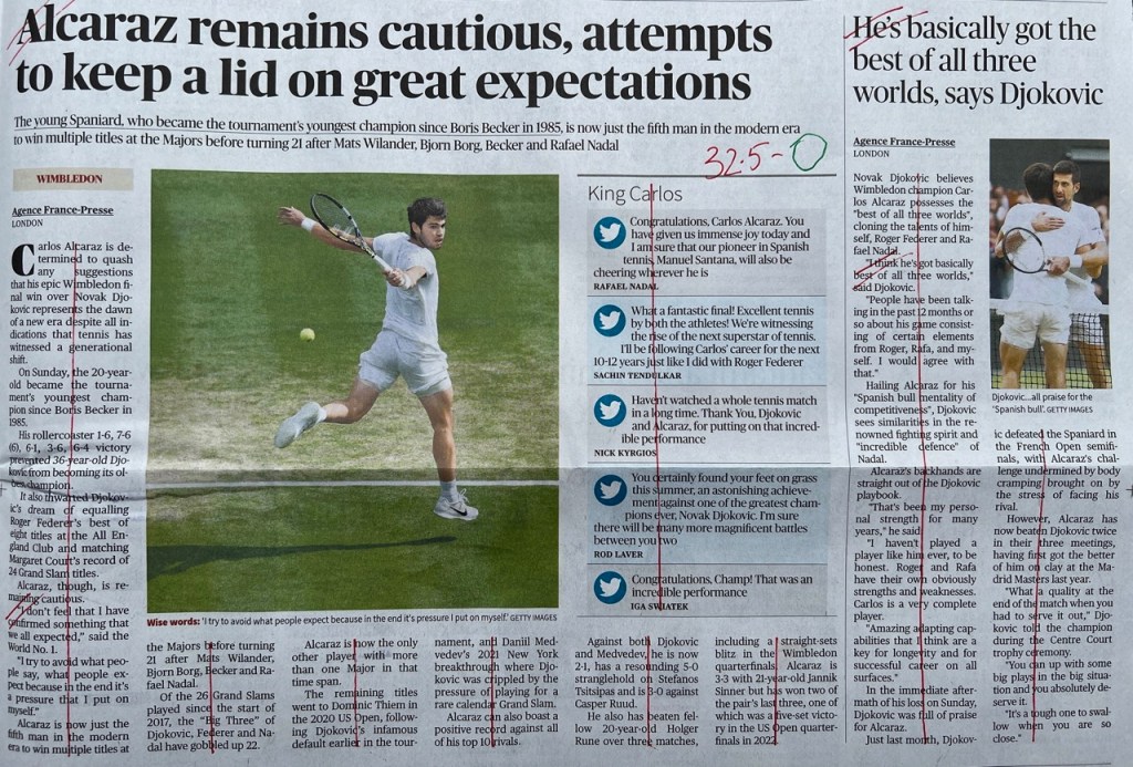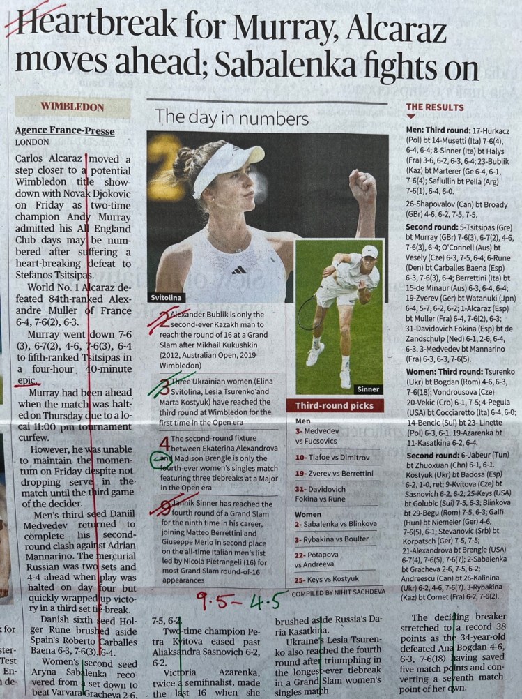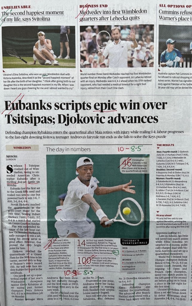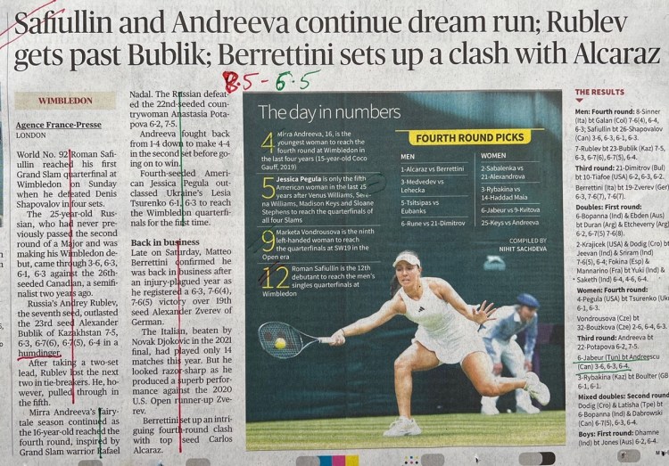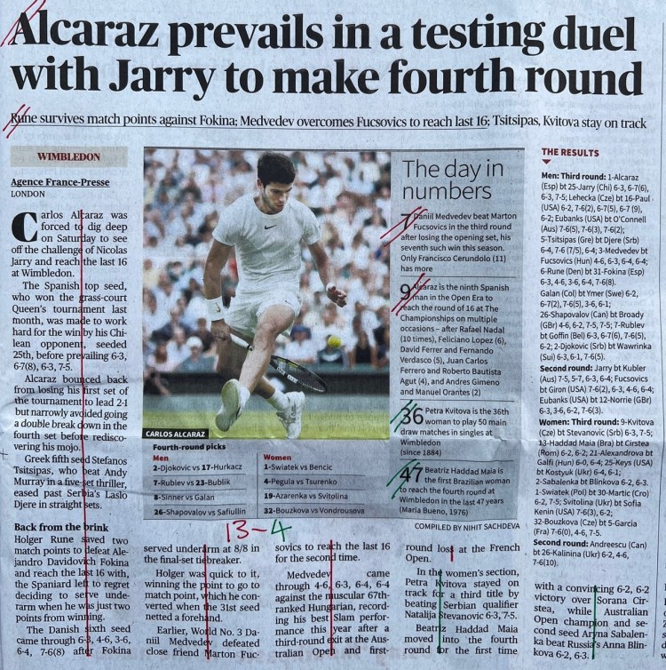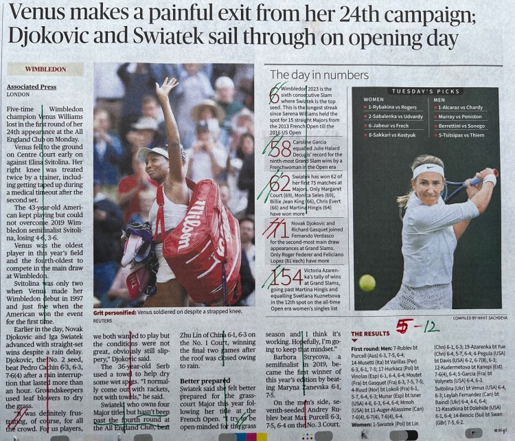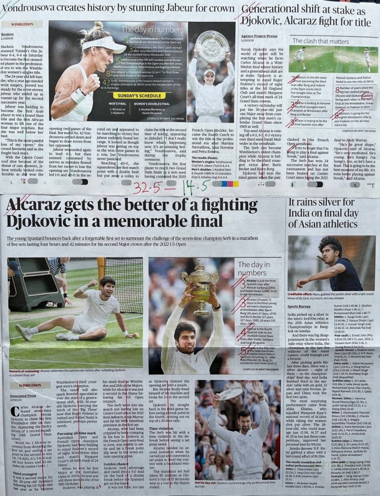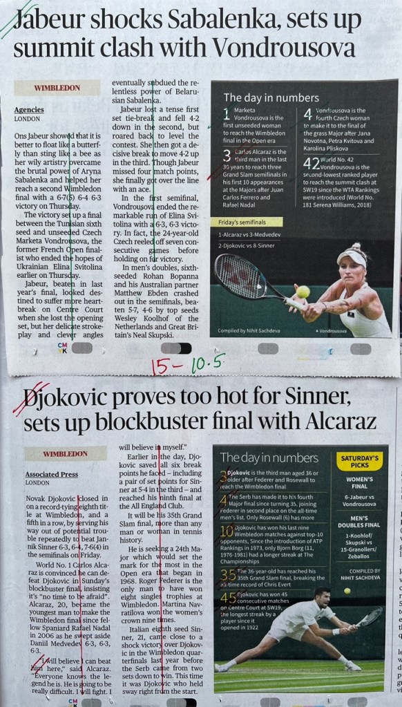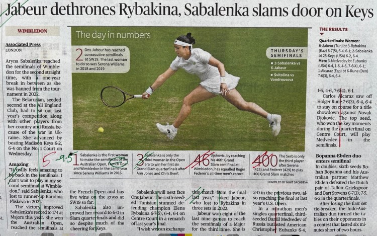 Wimbledon 2023 concluded yesterday, and throughout the tournament I kept track of how my newspaper – The Hindu – covered the men’s game vs. the women’s game in their sports pages, to see if there was any bias there. (Previously I covered the French Open.)