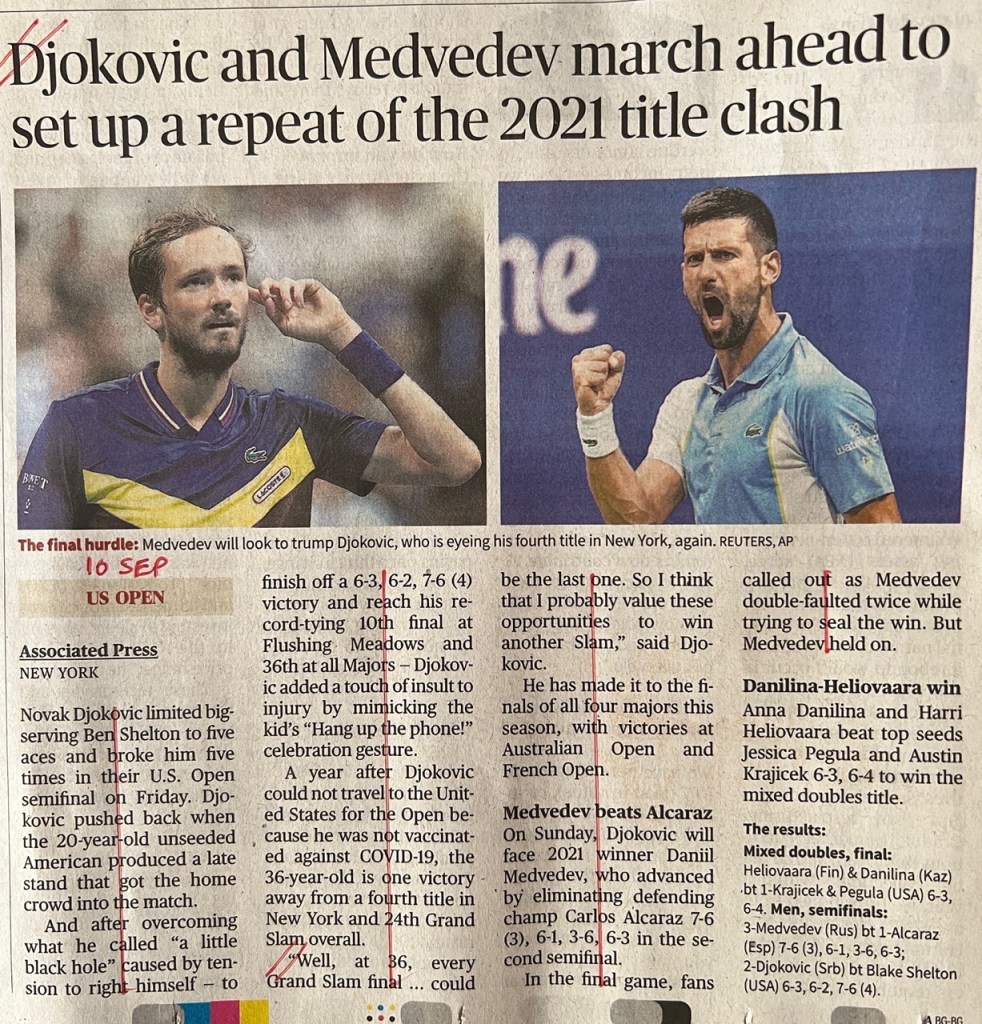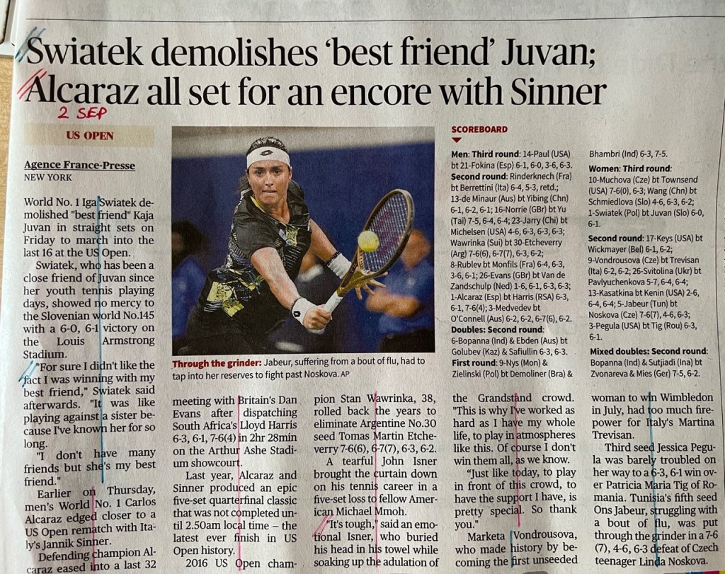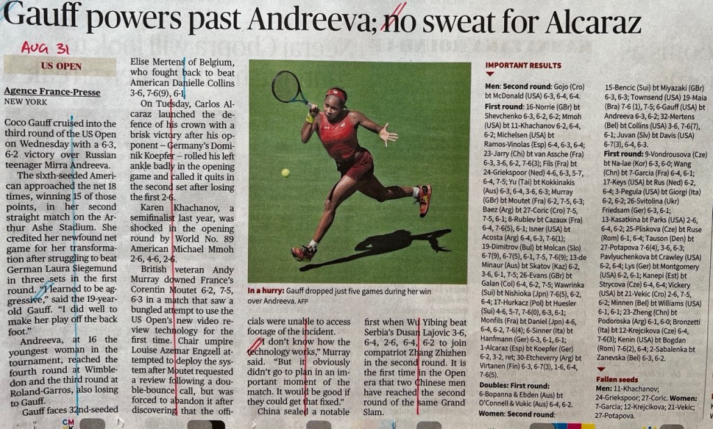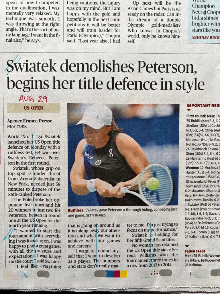 The US Open 2023 concluded yesterday, and throughout the tournament I kept track of how my newspaper – The Hindu – covered the men’s game vs. the women’s game in their sports pages, to see if there was any bias there. (Previously I covered Wimbledon.)