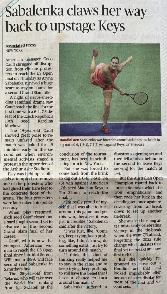 An instance of sexism in the report of the women’s final: the writer claimed that “Both players made a slew of mistakes in an error-strewn final”. Rubbish. Sabalenka did make a lot of errors, but Gauff did not: she only made 19 unforced errors in the 25 games. That’s a lower error rate than what either Djokovic or Medvedev made in their final. And the total error rate isn’t that different: 2.6 errors per game for the women’s final, and 2.2 in the men’s final.